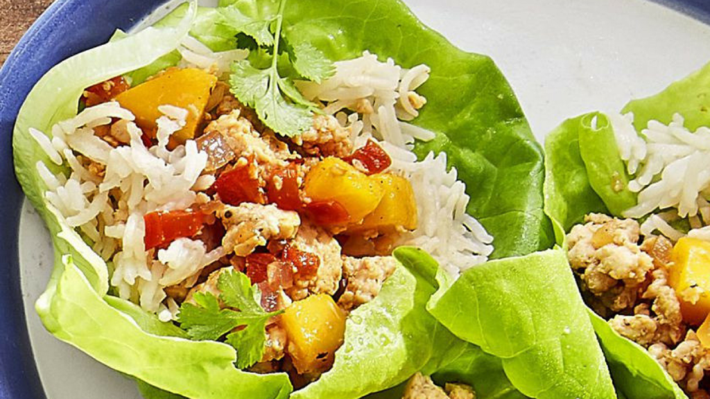 Фарш, красный лук и красный перец обжарьте на масле в большой сковороде до готовности. Добавьте соевый соус, приправу, чеснок и свежий имбирь, протушите еще минуту. Добавьте манго и кинзу, соль и перец. Подавайте рис и куриную смесь в листьях салата.