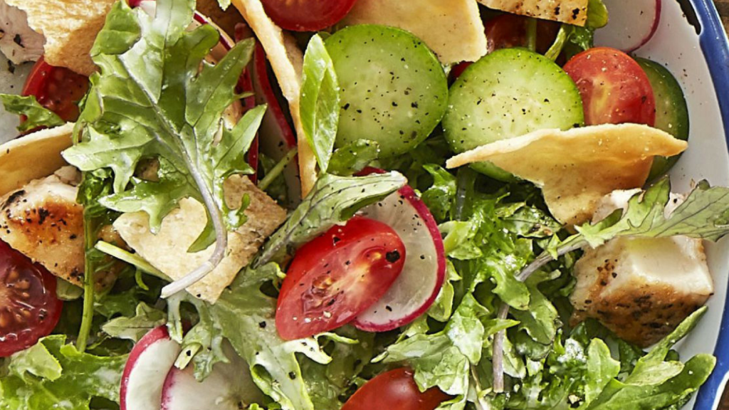 Смешать вместе свежий лимонный сок, тахини, 2 столовые ложки оливкового масла, 2 столовые ложки воды и нарезанный зубчик чеснока, приправить кошерной солью и черным перцем. Добавить нарезанную капусту кале, измельченный хлеб питу, огурцы, редиску, помидоры, лук и нарезанную курицу.