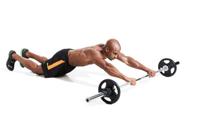 Положите штангу на пол, встаньте на колени лицом к ней. Примите упор лежа, обхватив гриф прямыми руками. Медленно перекатывайте штангу вперед, напрягая мышцы живота. Вернитесь в исходное положение, аналогичным образом подкатив штангу к себе.