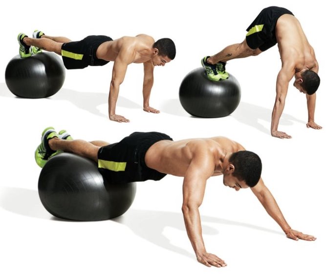 Встаньте в положение отжимания, при этом пальмами ног стойте на фитболе. Вы должны образовывать параллельную линию с полом. Поднимите бедра и подкотите мяч к себе, чтобы ваш торс стал вертикально к полу. Вы должны выглядеть как Супермен, летящий вниз. Вернитесь в положение отжимания и начните следующий повтор.