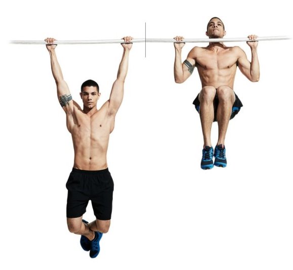 Подтянитесь на турнике, пока ваш подбородок не окажется над перекладиной, а затем согните ноги в коленях и тяните к груди. Затем разогните ноги, и опуститесь на вытянутые руки.