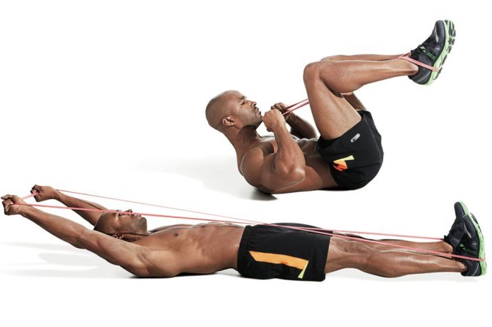 Ложитесь на спину на пол и набросьте эспандер на стопы ваших ног. Перекрестите концы эспандера, чтобы сделать «X» и схватить концы противоположными руками. Согните бедра и колени так, чтобы ваши колени были рядом с грудью, а руки держите перед собой. Затем выпрямите руки и ноги, чтобы ваше тело было одной прямой линией. Потом возвращайтесь в исходное положение.