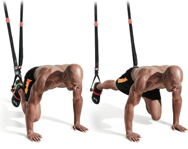 Поместите ноги в тренажер с подвесками и станьте в положение отжимания руками. Подведите одно колено к груди, пока другая нога остается вытянутой. Вернитесь в исходное положение, а потом подведите противоположную ногу к груди.