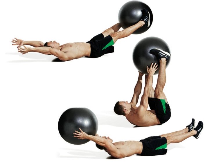 Ложитесь на спину на пол и держите фитбол между вашими лодыжками. Вытяните руки за голову. Выполняя скручивание одновременно поднимите к верху прямые руки и ноги и при этом передайте мяч с ног в руки. Вернитесь на пол и повторите упражнение, теперь передавая мяч от ваших рук к ногам.