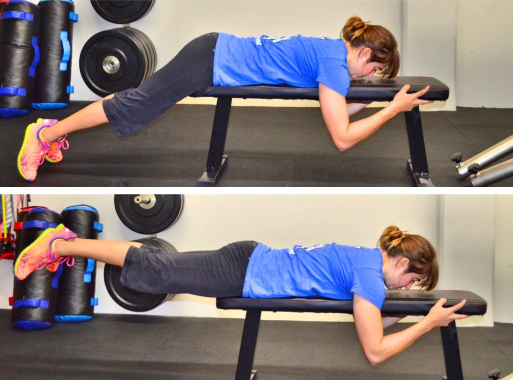 Лежа на животе, поднимите одновременно правую руку и левую ногу, потом поменяйте на левую руку и правую ногу. Выполните 4 повтора по 20 раз, перерыв — 30 секунд.
