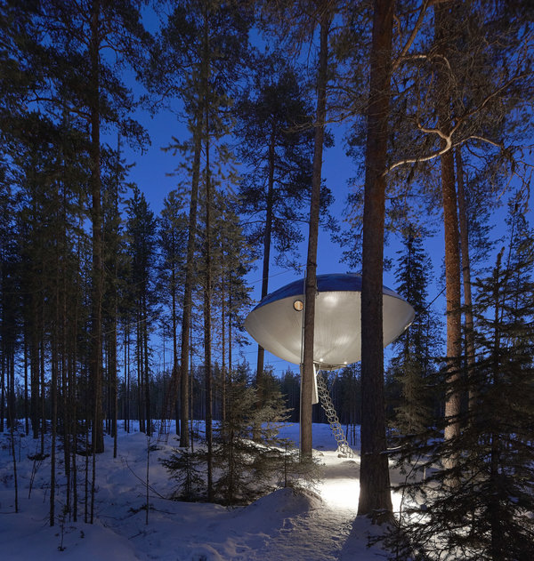 Treehotel в Хараде, Швеции, следует концепции номеров в стиле «домик на дереве», но также там есть прототип НЛО и куб с зеркальными стенами.