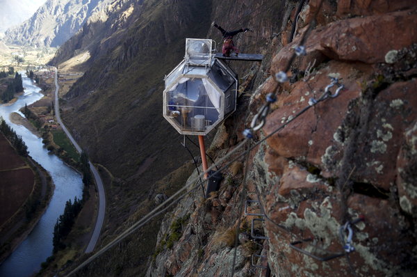 Skylodge Adventure Suites состоит из набора прозрачных боксов в Священной долине Инков (Перу). Чтобы добраться до боксов, нужно быть весьма смелым.