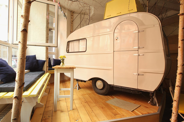 В Huettenpalast в Берлине гости останавливаются в старых кемпингах и деревянных домиках в бывшем здании завода.