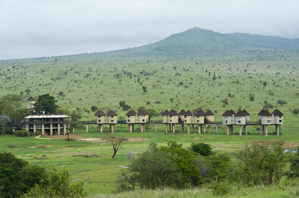 Salt Lick Lodge в Таита-Хиллз, Кении, предлагает панорамный вид на пейзаж и животных вокруг заповедника дикой природы Таиты Хиллз.