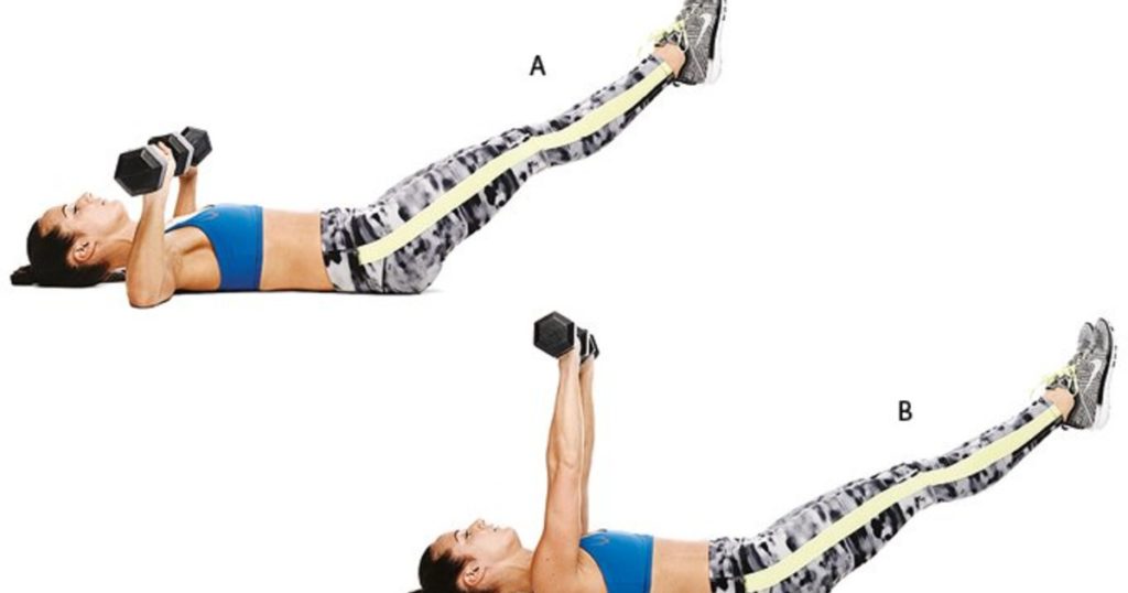 Возьмите в руки гантели весом 3-5 кг. Лягте на пол, подняв вверх прямые ноги, как показано на картинке. Поставьте руки на локти, зафиксировав дополнительный вес прямо над грудью. Выполняйте жим гантелей, не отрывая от пола поясницу. Можно выполнить облегченный вариант данного упражнения, поставив стопы на пол.