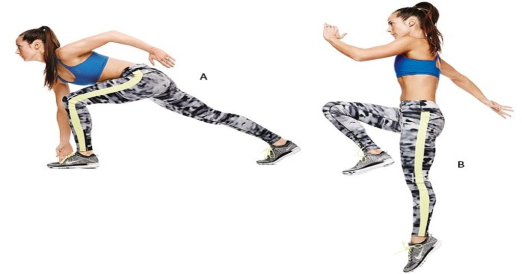 Станьте прямо — руки вдоль корпуса. Сделайте шаг правой ногой назад, опустившись в выпад. Правой рукой коснитесь пола, отведя левую назад. Выполните резкий прыжок вверх, подняв правое колено. Вернитесь в исходное положение и продолжайте выполнять прыжки еще 15 секунд.