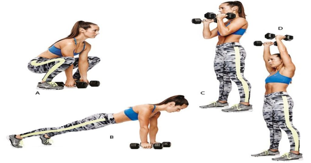 Опуститесь в присед, поставив перед собой гантели весом 3-4 кг. Опираясь на них, выпрыгните назад, оказавшись в планке. В прыжке снова вернитесь в присед и встаньте, подняв гантели к плечам. Выполните жим над головой и возвращайтесь в исходное положение.