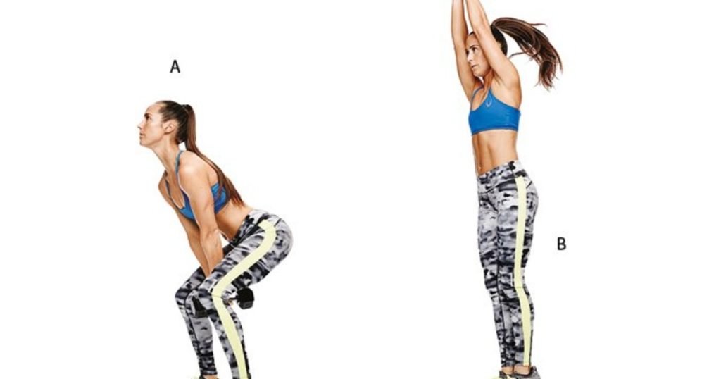 Возьмите в руки одну гантель весом 5-7 кг. Станьте прямо, поставив ноги шире таза. Выполните небольшой присед, опустив гантель между ног. Затем в прыжке выпрямите тело, подняв гантель над головой.