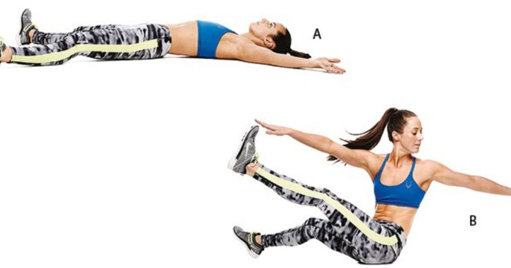 Лягте на спину, разведя в стороны руки и ноги, чтобы образовать телом букву Х. На один счет поднимите правую ногу и, развернув корпус, коснитесь правой стопы левой ладонью. Затем опуститесь в исходное положение и повторите то же движение с другой стороны.