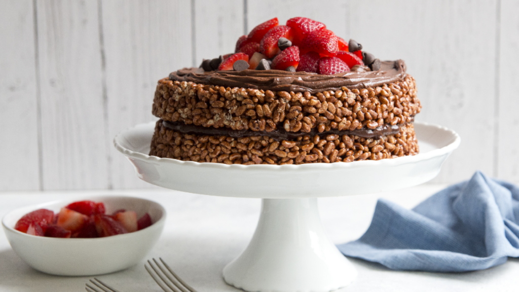 Чтобы сделать коржи из рисовых шариков, выстелите пергаментом 2 формы для выпечки. В большой кастрюле на медленном огне расплавьте кокосовое масло. Добавьте сироп коричневого риса и какао-порошок и перемешайте до однородности. Удалите с огня и добавьте рисовые шарики. Аккуратно перемешайте, пока зерна не будут полностью покрыты смесью какао. Разделите смесь между приготовленными формами, придавите и сгладьте верхнюю часть с помощью шпателя или ложки. Охлаждайте около 1 часа. Поместите один корж на сервировочную тарелку, сверху нанесите слой глазури и покройте вторым коржом. Украсьте клубникой и подавайте.