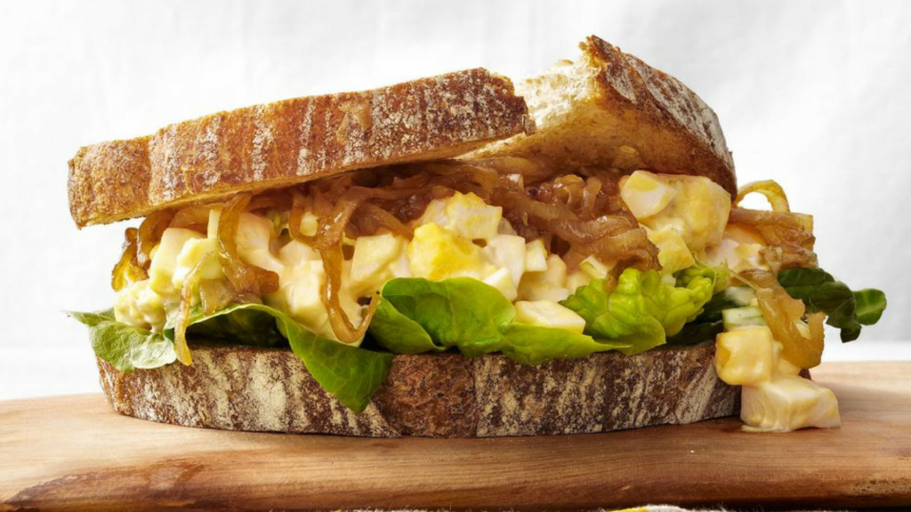 В большой миске смешайте нарезанные яйца, сельдерей, желтый лук, горчицу и оставшуюся соль. Добавьте майонез и осторожно перемешайте. Приправьте перцем по вкусу. На каждый кусочек хлеба поместите пару листьев салата, затем яичный салат и запеченный карамелизированный лук. Накройте другим куском хлеба, разрежьте сэндвичи пополам и подавайте.