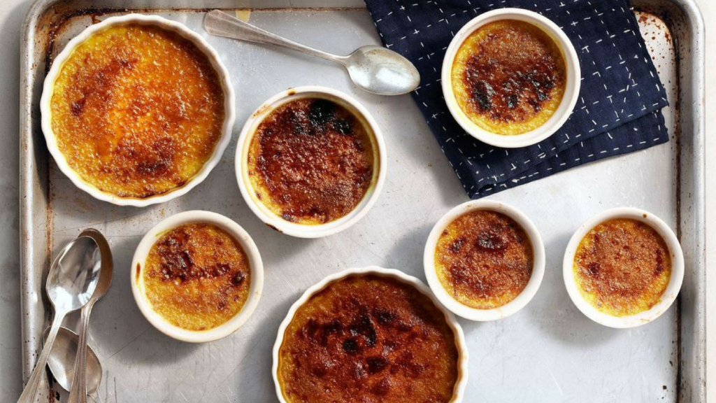 Оставшийся коричневый сахар просейте через сито в маленькую миску. Вытяните горшочки из холодильника и бумажным полотенцем промокните влагу, накопленную на верхушках заварного крема, затем посыпьте каждую порцию коричневым сахаром.