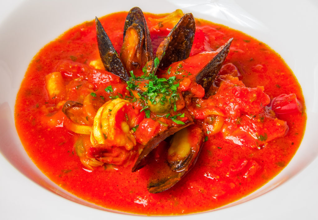 Протушите лук в кастрюле с маслом на слабом огне около 5 минут, потом добавьте к нему чили и чеснок. Через несколько минут добавьте томатную пасту и помидор, нарезанный дольками. Тушите на среднем огне 15 минут, чтобы помидоры размякли. Влейте вино и продолжайте готовить еще около 10 минут, пока не выкипит часть жидкости. Затем, добавьте бульон, цедру апельсина т доведите вместе до кипения. Добавьте кусочки рыбы, а через 5 минут – креветки и мидии. Когда моллюски раскроются – выключайте огонь. Готово! Подавайте с тостами и зеленью петрушки.