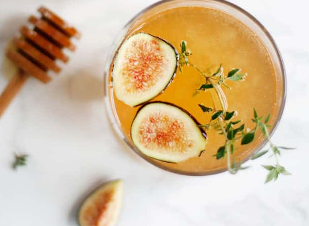 Смешайте мед, воду и инжир в маленькой кастрюле. Доведите это все до кипения, добавьте тимьян, готовьте пока инжир не размягчится. Уберите с огня, выньте тимьян, смешайте смесь блендером до однородной массы. В кувшине смешайте шампанское, яблочный сидр и апельсиновый ликер. Добавьте две столовые ложки инжирного пюре и размешайте.