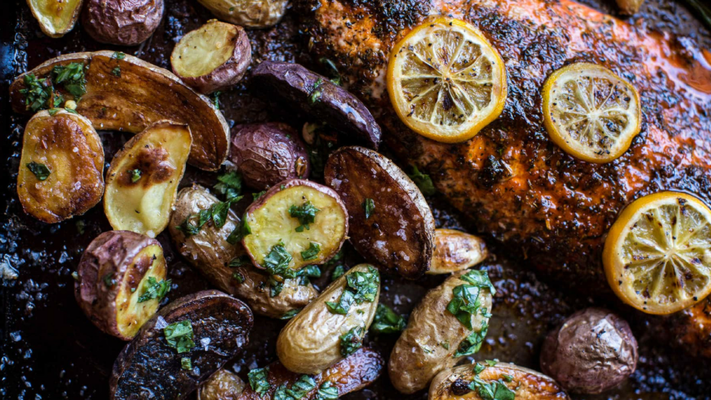 1. Лосось со спаржей, лимоном и картофелем