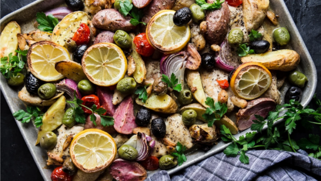 Разогрейте духовку. На листе для выпечки объедините курицу, 2 столовые ложки оливкового масла, лимонный сок, лимонную цедру, приправу Harissa, мед, соль и перец. Перемешайте, чтобы равномерно покрыть курицу. Добавьте сладкий картофель, лук и нут, оставшиеся 2 столовые ложки оливкового масла, еще немного перца и соли. Выровняйте все ровным слоем. Добавьте ломтики лимона и поместите в духовку. Готовьте в течение 40-45 минут. Отдельно объедините в миске сыр фета, оливки и оливковое масло. Подавайте курицу с фетой, маслинами и йогуртом, украшенную зеленью.
