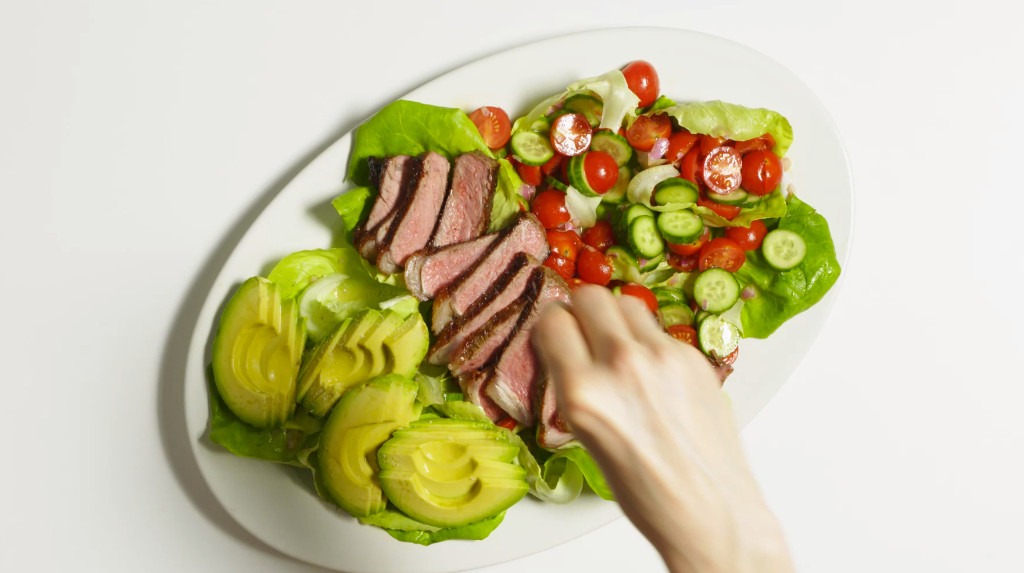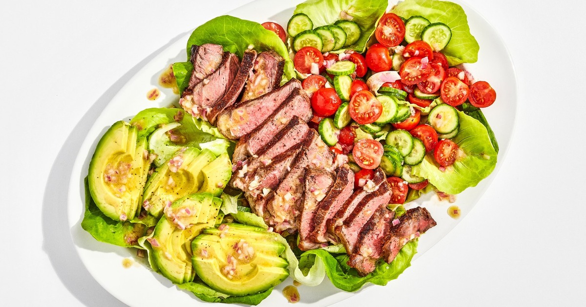 Засыпьте стейк солью и перцем, оставьте его при комнатной температуре примерно на час. Очистить и мелко нарезать 1 шалот и добавить в среднюю миску. Добавить и уксус и взбивать.Постоянно взбивая, медленно вливайте масло. Добавьте соли по вкусу. Нарежьте помидоры, огурцы. Смешайте в одной миске. Отделите салатные листья, но не режьте их. Нагреть сковороду. Натереть маслом стейк. Жарьте по 3 минуты с каждой стороны. Затем еще по минуте поджарьте на боковой части стейка. Если есть термометр, то поставьте его в середину мяса — должно быть 120-125 градусов. Уберите сковороду с огня, удалите излишки масла и протрите сковороду насухо. Налейте сливочное масло и бросьте веточки тимьяна. Верните стейк обратно на сковороду. Готовьте около 2 минут. Уберите стейк на разделочную доску. Пусть мясо отдохнет в течение 10 минут. На большой тарелке разложите листья салата, приправьте солью и слегка смажьте заправкой. Разложите остальные овощи. Авокадо нарежьте дольками и положите в другой части тарелке. Мясо нарежьте тонкими слайсами и положите по центру. Салат сбрызните заправкой еще раз и приправьте перцем.