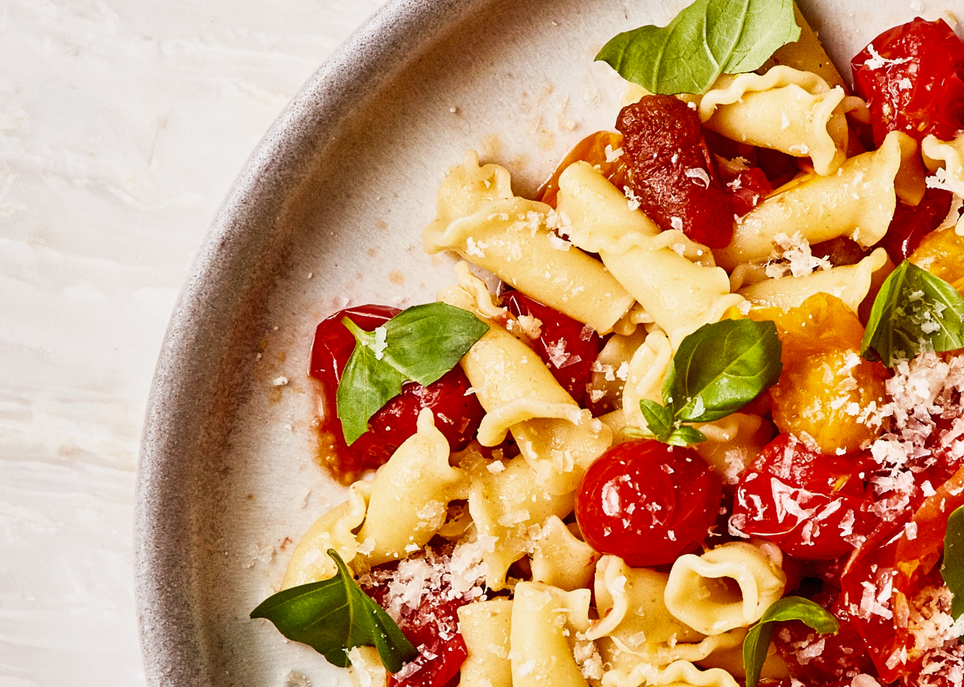 Сварите макароны согласно инструкциям на упаковке. Готовьте соус. Нагрейте 1/2 чашки масла в большой кастрюле на низком огне. Добавить чеснок и жарить, помешивая, до размягчения, но не поджаренного состояния, около 2 минут. Увеличьте тепло до среднего уровня и добавьте помидоры, красные перцовые хлопья, веточки с базиликом и соли. Варите, помешивая, пока помидоры не начнут лопаться, около 4 минут. Разбейте некоторые, но не все помидоры, чтобы помочь создать соус, затем продолжайте готовить, периодически помешивая, пока не получится утолщенный соус, и около половины помидоров полностью не будут сломаны и половина останется целыми, примерно 10-12 минут. Выбросьте веточки базилика. Готовые макароны смешайте с соусом, готовьте минут 3. Посыпьте 30 г пармезана. Перед подачей еще раз посыпать пармезаном и листьями базилика.