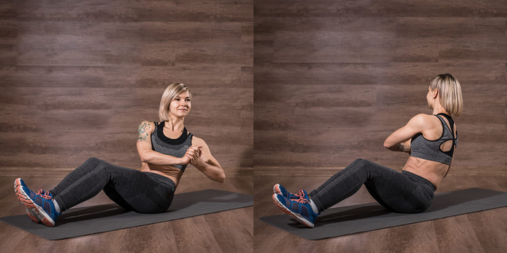 Сядьте на пол, колени согнуты, а пятки слегка касаются пола. Наклонитесь немного назад и приподнимите ноги над полом. Начинайте скручиваться влево, а затем вправо. Сделайте 3 подхода по 15-20 повторений.