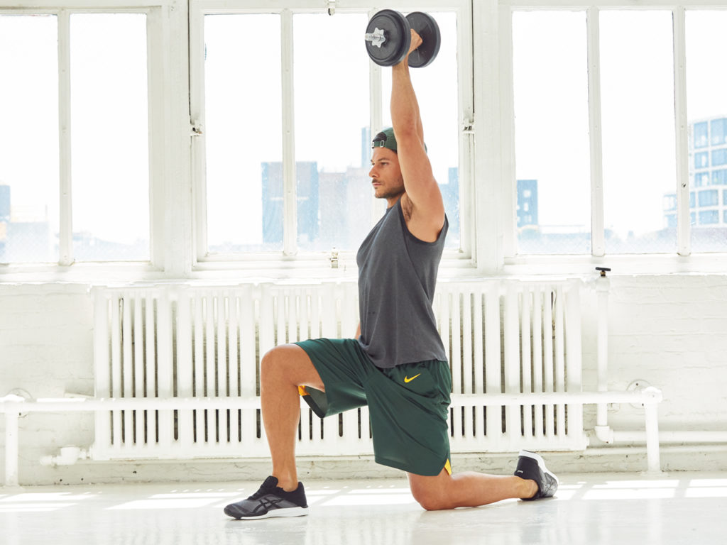 Встаньте прямо, поставьте ноги на ширину плеч, возьмите гантель в правую руку, левую руку держите на поясе. Выполните выпад на правую ногу одновременно поднимая гантель максимально вверх. Вернитесь в исходное положение и повторите выпады, чередуя ноги. Сделайте 10 раз, затем возьмите гантель в другую руку и повторите упражнение.