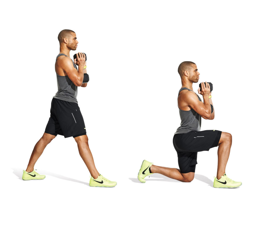 Встаньте прямо, поставьте правую ногу вперед, а левую назад. Гантель держите в руках перед собой. Напрягайте пресс, чтобы сохранять баланс. Медленно сгибайте переднюю и заднюю ногу, опускаясь в выпад, затем возвращайтесь в исходное положение. Выполните 10 раз, затем поменяйте ноги и повторите упражнение.