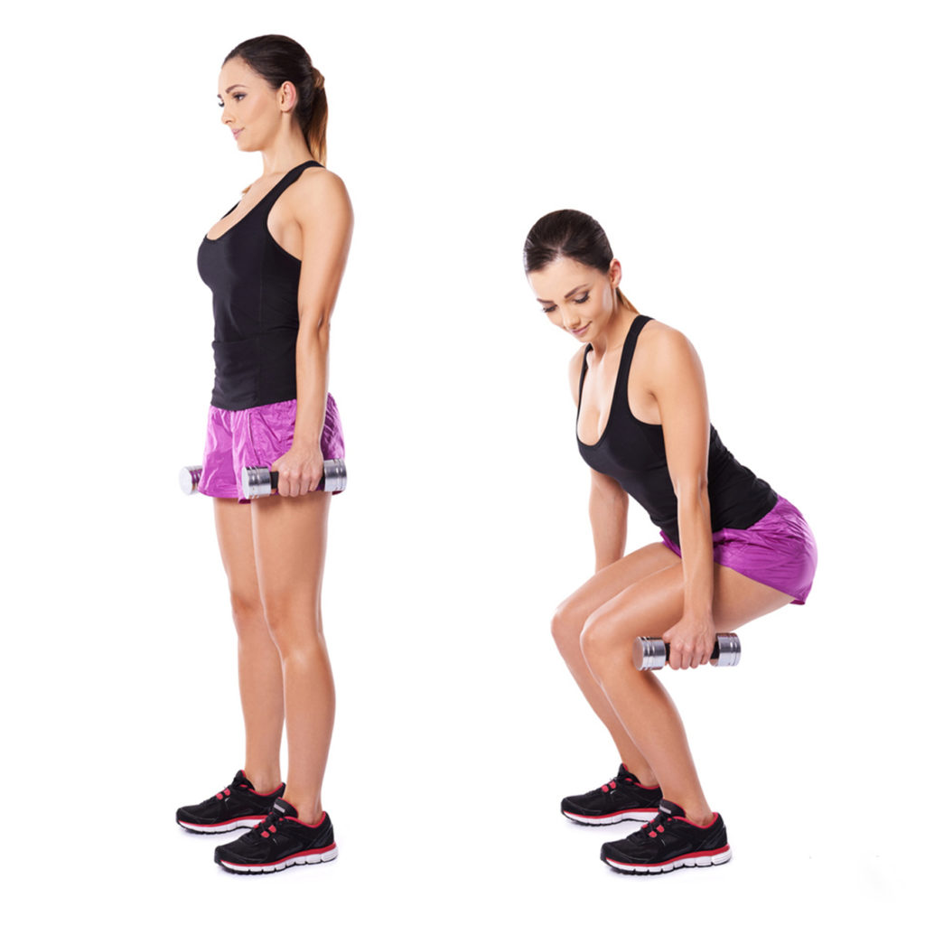 Встаньте прямо, поставьте ноги на ширину плеч, возьмите в руки гантели, ягодицы держите напряженными. Выполните глубокий присед, опуская руки. Ваша спина должна оказаться в параллели с полом. Вернитесь в исходное положение и повторите приседания 10 раз.