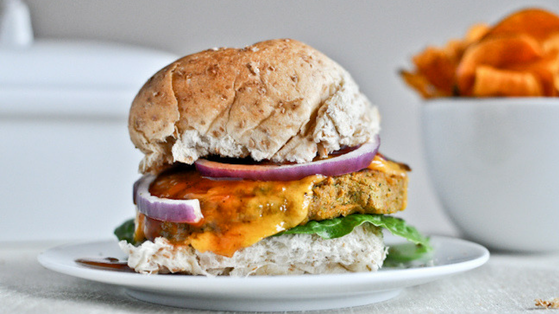 Обжарить на оливковом масле лук с солью. В блендере смешать брокколи и морковь. Добавить нут, соус, мед, муку, сыр, лук, соль, перец, паприку и луковый порошок, превратить в пюре. Сформировать котлеты и обжарить с обеих сторон на сковороде. Подавать на булочке с дополнительным сыром, красным луком и соусом.