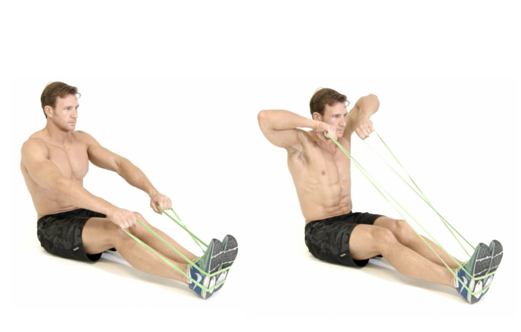 Сядьте прямо, вытяните ноги вперед, возьмите в руки резинку-эспандер и обхватите ею носки. Потяните резинку на себя, сгибая руки в локтях. Вернитесь в исходное положение и повторите упражнение 15-20 раз.