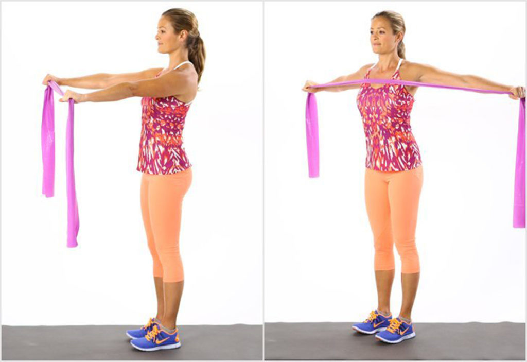 Встаньте прямо, возьмите в руки резинку эспандер, соедините лопатки. Начинайте медленно сводить и разводить руки, натягивая резинку. Сделайте 20 повторений.