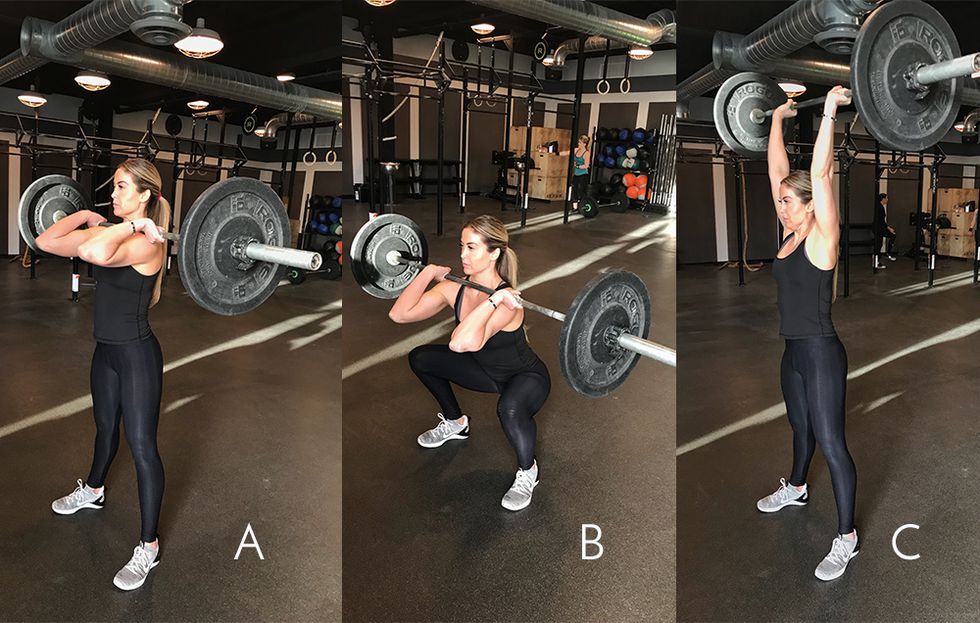 Поднимите штангу к плечам, держа ноги на ширине плеч. Удерживая вес, выполните полное приседание, немного отодвинув бедра назад. Теперь оттолкнитесь пятками и возвращайтесь в исходную позицию. Во время подъема вытолкните штангу вверх и зафиксируйте ее над головой. Выполните 3 подхода по 12 повторений.