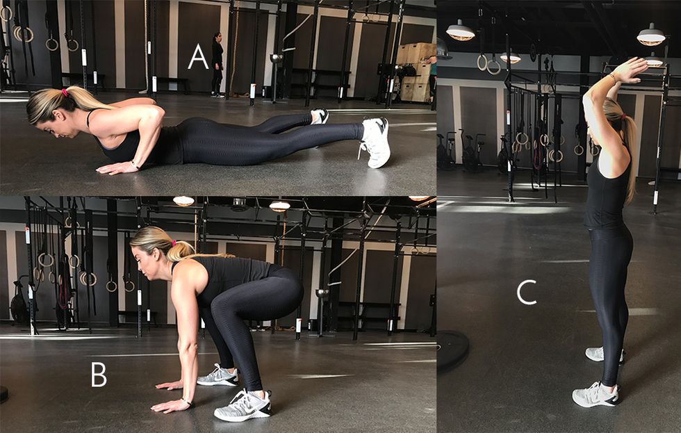 Выполните приседание и обопритесь ладонями о пол. Сразу же после этого выбросьте ноги назад, чтобы занять положение для отжиманий. Выполните 1 отжимание и переставьте ноги ближе к груди, чтобы встать. После возвращения в исходную позицию, выполните высокий прыжок на месте. Работайте в максимальном темпе на протяжении 60 секунд.