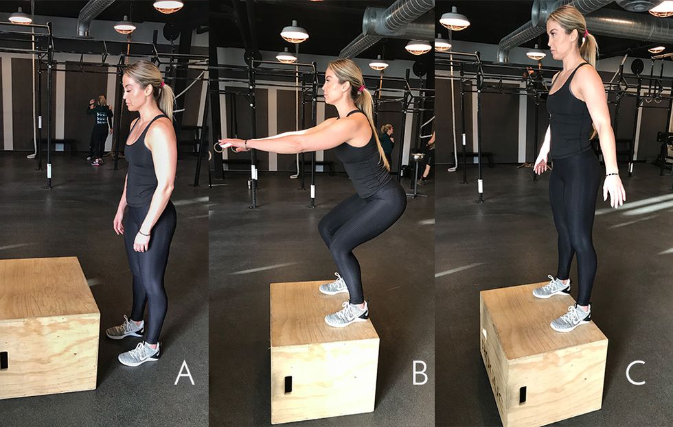 Встаньте возле скамейки или прочной устойчивой коробки на расстоянии около 30 сантиметров. Расположите ноги на ширине плеч и немного согните колени. Запрыгните на возвышение одновременно обеими ногами, помогая себе движением рук. Затем выпрямитесь и возвращайтесь в исходное положение. Выполните 3 подхода, длительностью 60 секунд.