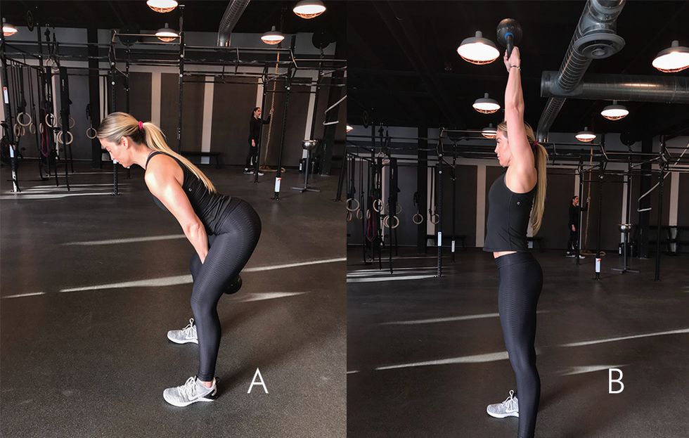 Расположите ноги на ширине плеч, немного согните их в коленях и отодвиньте бедра назад. Возьмите гирю обеими руками и удерживайте ее внизу. Теперь резко выпрямитесь и поднимите гирю над головой. Выполните 3 подхода по 15 повторений.