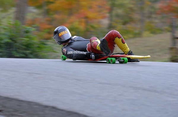 Стрітландінг – це швидкісний спуск на спеціальному скейтборді по асфальтовій трасі в горизонтальному положенні. Автори ідеї – зовсім безголові каліфорнійські скейтери 70-х, які одного разу здогадалися злетіти по крутому схилу, лежачи на дошці.