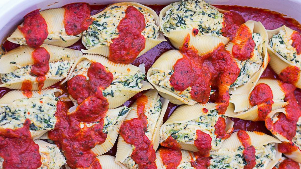 На большом противне равномерно распределите около 1 чашки соуса маринара. Начините ракушки начинкой и выложите на противень открытой стороной вверх. Сверху полейте соусом маринара и запекайте в разогретой духовке около 25 минут.