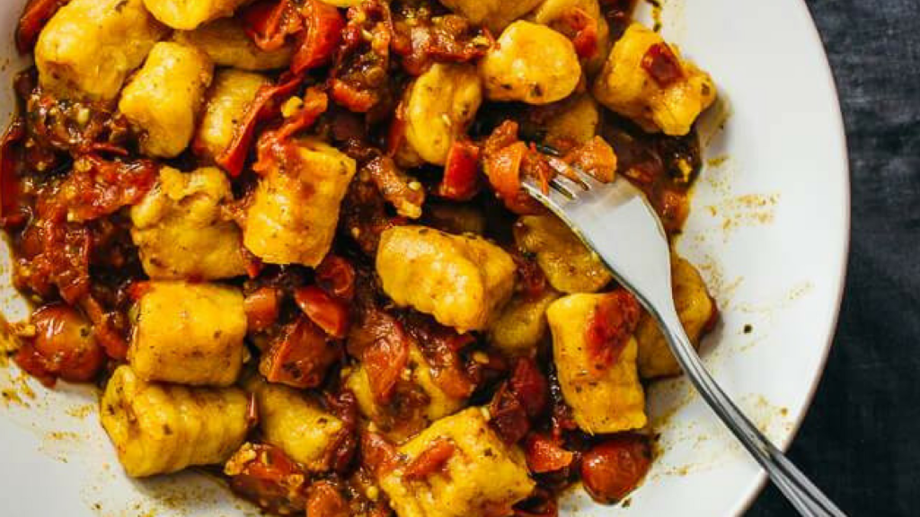Проколите каждый сладкий картофель несколько раз вилкой. Положите в микроволновку на 5-10 минут, выложите и дайте остыть. Мякоть батата превратите в пюре и разложите тонким слоем на рабочей поверхности. Равномерно распределите муку над слоем сладкого картофеля. Пальцами начинайте аккуратно смешивать пюре с мукой и формировать шар из теста. Разделите тесто на 4 части и сформируйте из него колбаски, нарежьте их на кусочки, при желании сделайте на каждом клецке бороздки с помощью вилки. Сварите клецки в кипящей воде и подавайте с соусом.