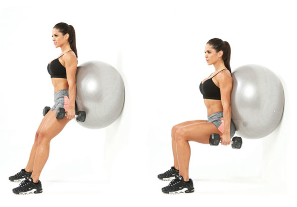 Встаньте прямо, поставьте ноги на ширину плеч, зафиксируйте фитбол между вашей поясницей и стеной. Выполняйте глубокие приседания, сохраняя положение мяча. Ваш позвоночник должен оставаться в нейтральном положении. Сделайте 2 подхода по 10-15 приседаний.
