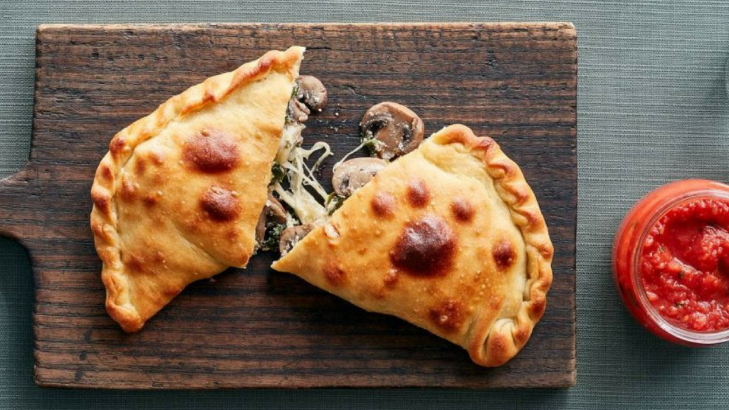 Раскатайте тесто для пиццы на два диска диаметром около 20 см. Распределите грибы на половину каждого теста, стараясь не закрывать приподнятый край. Разбросайте кубики моцареллы над грибами и накройте свободной частью теста. Обжарьте края, чтобы соки не могли вытечь. Запекайте в духовке 10 минут, перед подачей сбрызните небольшим количеством оливкового масла.