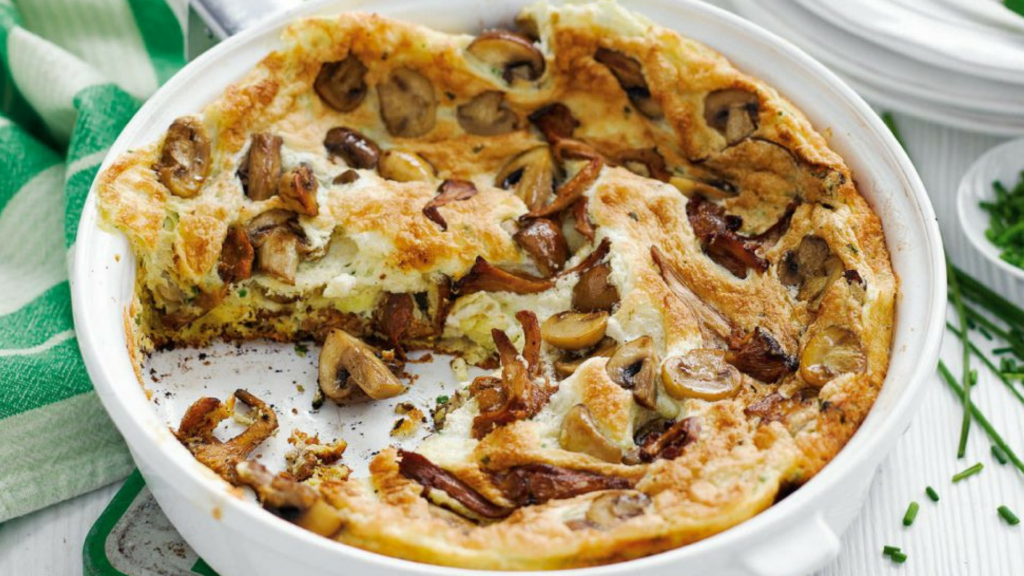 Нагрейте масло в большой сковородке с крышкой. Обжарьте грибы, не слишком часто помешивая. Добавьте шалот и готовьте до мягкости. Смешайте яйца и йогурт вместе, затем приправьте щепоткой морской соли и перца. Взбивайте электрическим венчиком (или энергично вручную) до очень пенистого состояния. Вылейте смесь в кастрюлю, добавьте травы и накройте крышкой. Готовьте на минимальном огне.
