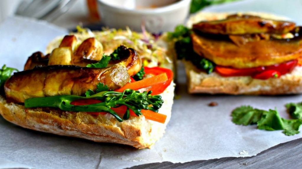 Нарежьте шиитаке и устричные грибы, затем вырежьте корни из грибов еноки. В сковороде или воке разогрейте масло на среднем огне, добавьте лимонную траву и чили, перемешайте. Добавьте все грибы и хорошо перемешайте, затем посыпьте солью и полейте соевым соусом. Багеты разделите вдоль и удалите часть мякоти. Снова соедините половинки и поджарьте хлеб в духовке. Намажьте хлеб арахисовым маслом, положите грибную начинку, расположите сверху кусочки огурца и грубо нарезанный кориандр. Посыпьте семенами кунжута, затем осторожно соедините половинки багета и ешьте!