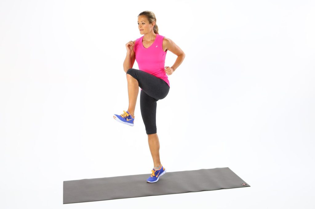 Как бы ни был полезен бег для сердечно-сосудистой системы (даже если вы просто бегаете из комнаты в комнату), он станет ещё лучше, если вы будете при этом высоко поднимать колени. Встаньте прямо, руки согните в локтях. Ноги поставьте на ширину таза. Начните бежать на месте, при этом поднимая колени до уровня бёдер. Напрягите при этом мышцы пресса, не сутультесь. Грудная клетка распрямлена. Следите за дыханием.