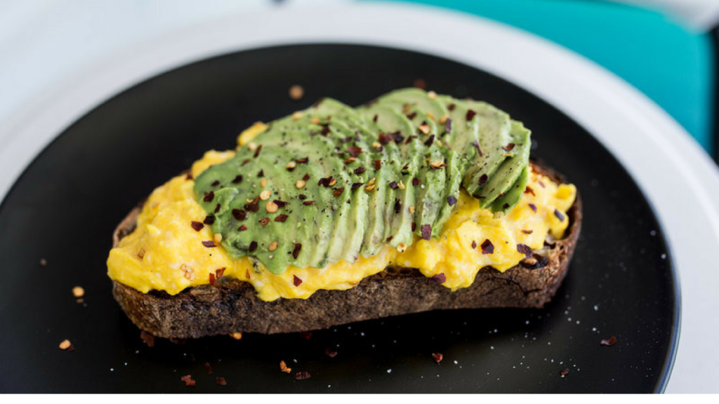 Подсушить на сковороде или в тостере хлеб. Смазать сковороду кокосовым маслом и поджарить на ней два яйца. Положить яйца на хлеб и сверху прикрыть мякотью авокадо. Для более пряного вкуса можно посыпать хлопьями чили.