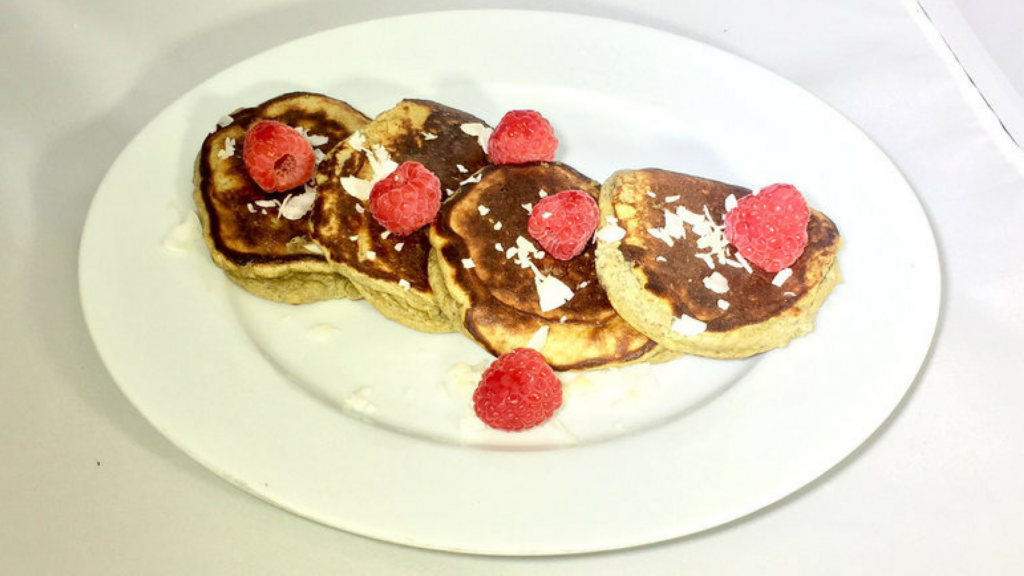 Отделить белки от желтков, взбить яичные белки в миске до образования пены и пока отложить. В другой миске смешать оставшиеся ингредиенты с желтками и взбить до однородности. Добавить в смесь белки и хорошо перемешать. На горячую сковородку нанести кокосовое масло и равномерно налить блины. Жарить по 2 минуты с каждой стороны. Перед подачей добавить ягоды и кокосовую стружку.