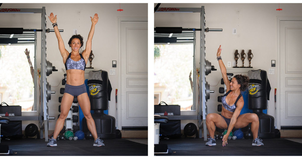 Станьте прямо, поставив ноги шире таза и подняв прямые руки над головой. Выполните присед, коснувшись правой ладонью носка левой ноги. Затем вернитесь в исходное положение и во время следующего приседания коснитесь левой ладонью правого носка. Продолжайте поворачивать корпус при каждом приседе. Следите за тем, чтобы в верхней точке ваш пресс был максимально напряжен, а руки вытянуты, как струны.