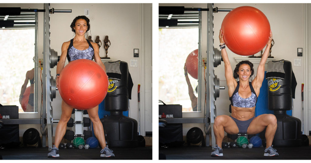 Примите исходное положение для приседания (ноги шире таза), держа в руках фитбол. Выполняя присед, поднимайте фитбол на вытянутых руках над головой. На выдохе поднимайтесь вверх, опуская мяч вниз.